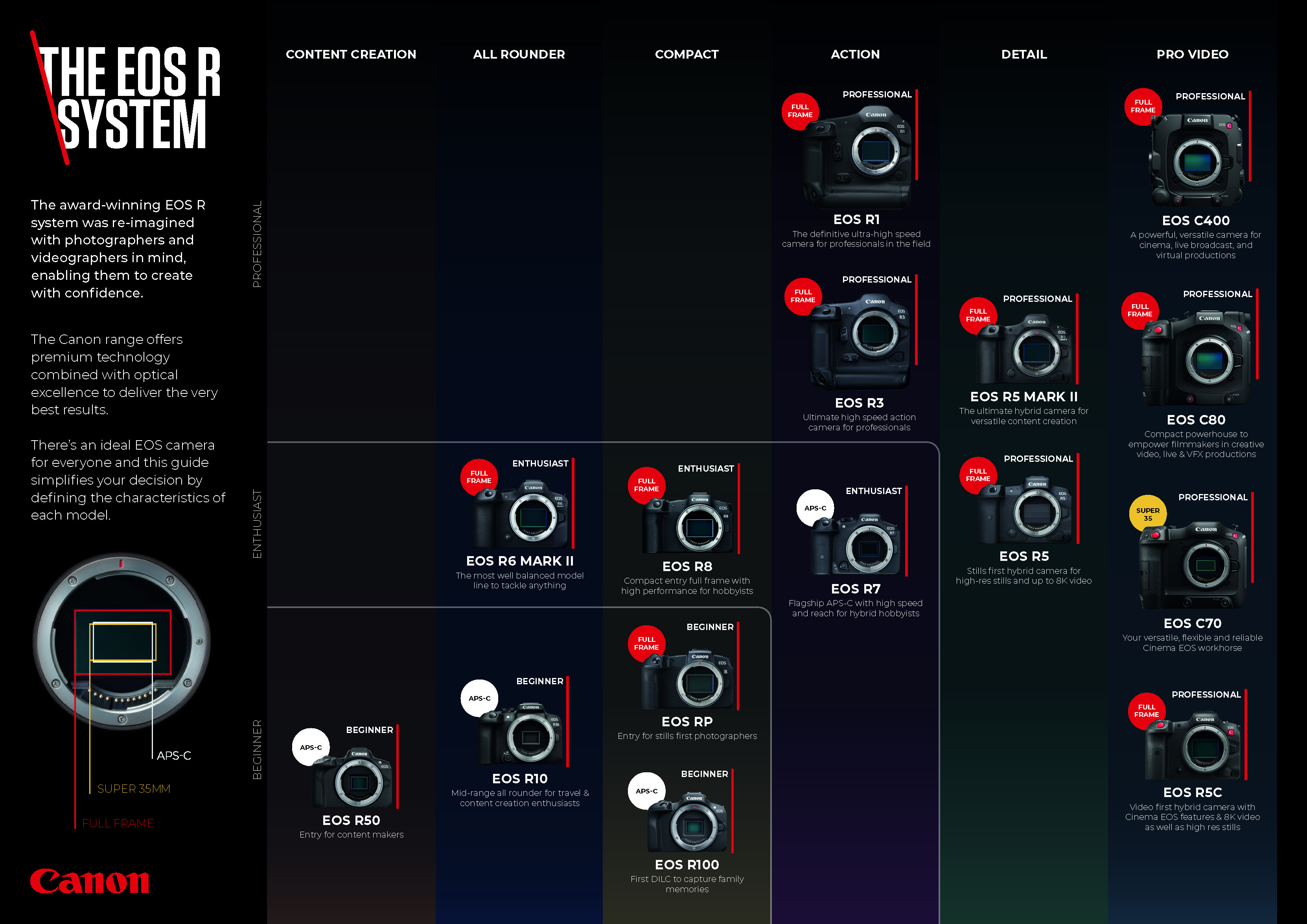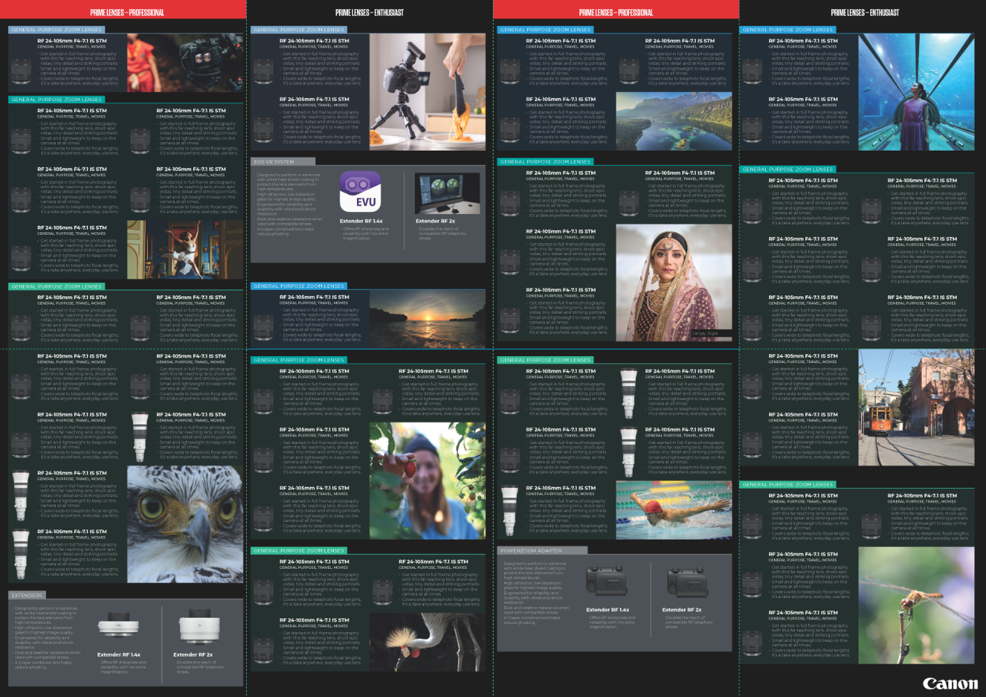 A significant portion of the development involved architecting and updating complex InDesign brochures and large-format catalogs. I utilized a systematic approach, establishing modular design systems with master pages and reusable component libraries to ensure cross-market consistency. Every asset, from retail posters to sales sheets, underwent rigorous evaluation to ensure technical accuracy and strict adherence to Canon’s Global Brand Corporate Identity (CI).