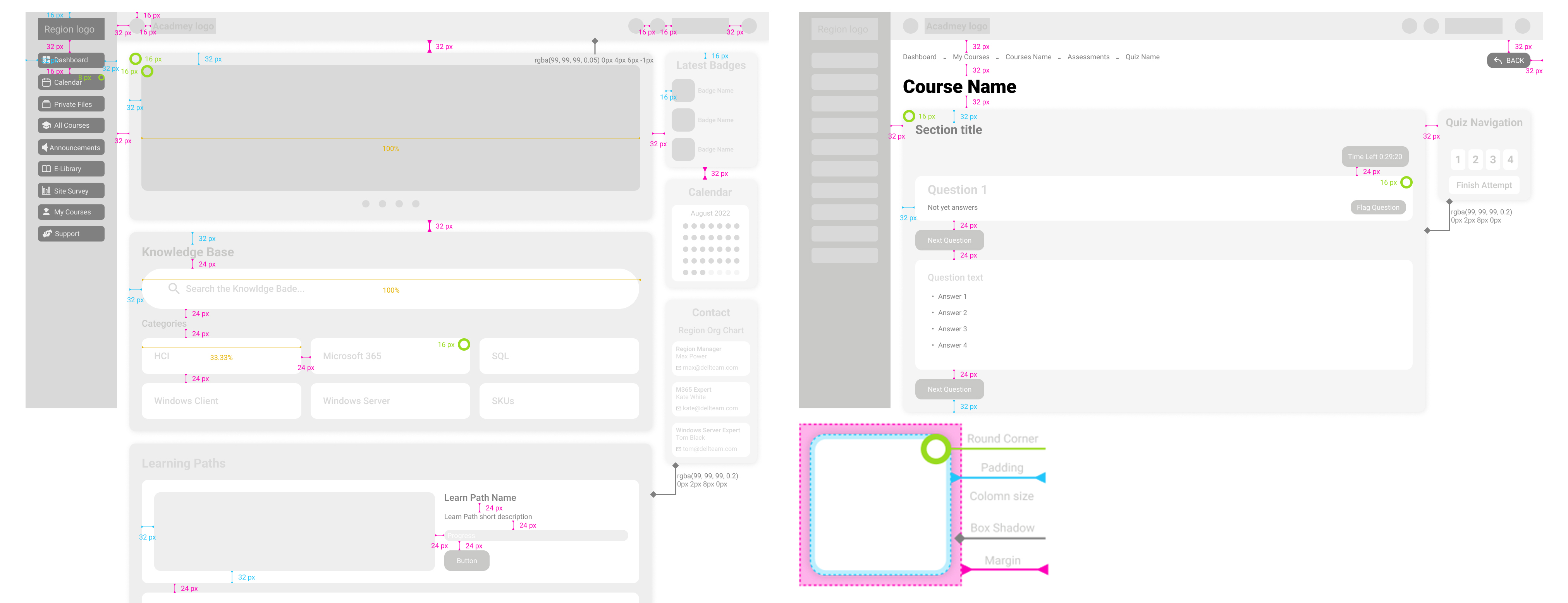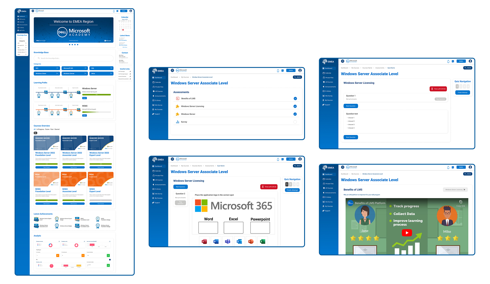 The project originated as an initial testing portal using the WordPress plugin LearnDash, but issues with email delivery and shallow reporting necessitated a more robust solution. I conducted an extensive research phase, attending learning technology live events to find an all-in-one enterprise platform. Once MapleLMS was selected, I used Figma to wireframe a custom UI based on the LMS layout, but enhanced it with personalized widgets, such as a knowledge base search bar and a custom-designed learning path.